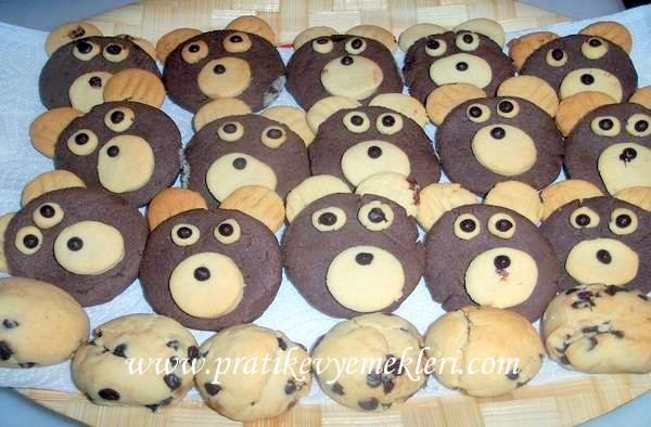 Kakao ve damla çikolata hariç tüm malzemeler kulak memesi kıvamında yoğurulur sonra hamur yarıya bölünüp bi yarısına kakao katılır yoğurulur. Tezgahta her iki hamur ayrı ayrı açılır kakaolu hamurdan çay bardağı ile yuvarlaklar kesilir ayının başı olur beyaz hamurdanda pet şişe kapağı ile yuvarlaklar kesilir kulak ve burun kısmı olur kulaklar ile burun kısmını yapıştırırken yumurta akı kulanın daha iyi yapışmaları için, beyaz hamurdan minik gözlerde yapıştırın damla çikolata ilede beyaz hamurdan göz yaptığımız yere damla çikolata koyun ve bide burnuna, 170 derece fırında 10 dk civarında pişirin. Ben biraz fazla pişirmişim kızartmamaya özen gösterin.