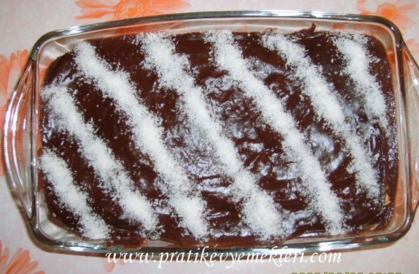 Kakolu puding 3,5 su bardağı süt ile pişirilerek hazırlanır. Daha sonra bisküviler tek tek sütün içine batırılarak tepsiye dizilir. Arasına kakolu puding dökülür. Puding bitine kadar bu işleme devam edilir ve en son kata bisküviler dizilir. Daha sonra çikolata sos için malzemeler karıştırılır ve pişirilir. Piştikten sonra ocaktan alınır. İçine çikolatalar kırılarak katılır ve karıştırılır. Hazırlanan sos pastanın en üst katına dökülür. Buzdolabında 2-3 saat bekletilen pasta arzuya göre süslendikten sonra yemeye hazır….afiyet olsun… bu ölçülerle küçük bir pasta çıkıyor siz isteğe göre malzemeyi 2 katına çıkarabilirsiniz.