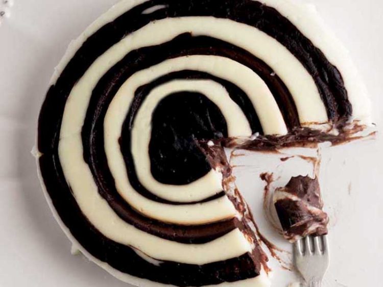 Tencereye tereyağı, sıvıyağı ve unu koyup, orta ateşte, fazla sarartmadan 3-4 dakika kavuruyoruz. Ocağı söndürüp, 1 litre soğuk sütü ekliyoruz. Çırpma teliyle hiç topak kalmayıncaya kadar çırpıp, karışımın yarısını başka bir tencereye bölüyoruz. Tencerelerden birine kakaoyu ekliyoruz. Her iki tencereye de 4’er yemek kaşığı tozşeker koyup, karıştırarak pişiriyoruz. Ocaktan aldığımız tencerelerden kakaolu olana bitter çikolatayı, beyaz olana da 1 paket vanilyayı ekliyoruz. Muhallebileri mikserle 1-2 dakika çırpıyoruz. 28-30 cm çapında bir borcamı soğuk su ile çalkalayıp, ortasına bir kepçe beyaz muhallebi döküyoruz. Beyaz muhallebinin tam ortasına gelecek şekilde bir kepçe çikolatalı muhallebi döküyoruz. Bu şekilde bir kepçe birinden, bir kepçe diğerinden dökerek işlemi tamamlıyoruz. Her seferinde tepsinin tam ortasına döküyoruz. Biz dökdükçe muhallebi yanlara doğru yayılıyor. Oda sıcaklığına gelinceye kadar bekletip, daha sonra buzdolabına koyup 4-5 saat dinlendiriyoruz. Üçgen şekilde dilimleyerek servis yapabilirsiniz. alttaki fotoda vanilyalı pudingi vişne suyuyla pişirip yapmıştım. Öyle de yapabilirsiniz. Afiyet olsun
