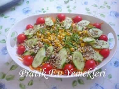 Marulu ve yeşil soğanı 10 dakika kadar sirkeli suda bekletelim ve yıkayıp doğrayalım ve biz yayvan salata tabağının ortasına yerleştirelim kenarlarına ayıklayıp rendelediğimiz havuçlarıda ilave edelim mısırlarıda marulların üzerine gezdirelim sonra alacalı soyduğumuz salatalıkları ve domateslerine ilave edip cevizi aycekirdeklerini ve keten tohumunuda ekleyelim .Nar ekşisi tuz ve zeytinyağ ile soslayıp servis yapalım .