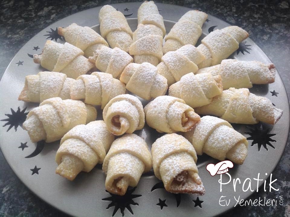 Tüm hamur malzemelerini karıştırın ve güzelce yoğurun. Ele yapışmayan orta sertlikte bir hamur elde edin. 1 saat kadar buzdolabında dinlendirin. İç malzemesi için elmayı rendeleyin ve şekerle beraber küçük bir tavada suyunu salıp çekene kadar pişirin. Ceviz ve tarçını atıp, kapatın. Soğumaya bırakın. Hamuru ikiye bölün ve merdaneyle açın. bıçak yardımıyla üçgen olacak şekilde kesin. Geniş kısmına harç koyarak rulo yapın. Yağlanmış tepsiye dizin. Önceden ısıtılmış 180 derece fırında 20-25 dk civarında kontrol ederek pişirin. Renginin beyaz kalmasına dikkat edin. Pişen kurabiyeleri servis tabağına alıp, soğumaya bırakın. Soğuduktan sonra üzerine pudra şekeri serpin. Afiyet olsun