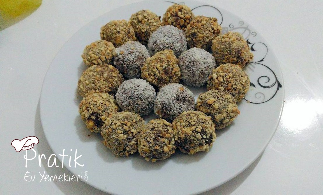 Bisküvi ve çerezler hariç, tüm malzemeyi tencerenin içinde sürekli karıştırarak pişirin. Koyulaşıp, kaynadıktan sonra altını kapatın ve mikserle 3-4 dk çırpın. Bisküvileri ufalayıp içine katın. Damla çikolata iri iri kırılmış fındıkları da ekleyin karıştırın. Elinizi her seferinde ıslatıp karışımdan parçalar koparıp yuvarlayın. Arzuya göre hindistan cevizi, fındık yada pasta süslerine bulayın. Afiyet olsun