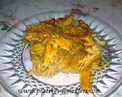 Tavuk haşlanır küçük parçalara ayrılır. Yemeklik doğranan soğan kavrulur, biber, salça, domates eklenip pişirilir. Ateşten indirmeden tavuklar da eklenip bir kaç kez karıştırılıp ocaktan alınır. Pirinçler iyice yıkanıp tepsiye yayılır üzerine hazırlamış olduğumuz tavuklu harç eşit olarak yayılır. Üzerine 8 bardak tavuk suyu eklenir. 200 derece önceden ısıtılmış fırında 20 dakika suyu çekene kadar pişirilir. Börek gibi dilimlenip servis edilir. Afiyet olsun ((: