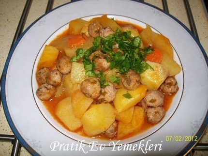 Kıyma, tuz, karabiber, galeta unu ve ince doğranan birkaç dal maydonoz, 2-3 dakika yoğrulur. Fındık büyüklüğünde köfteler yapılır, bu esnada elimizi ıslatırsak işimiz daha kolaylaşır. Küçük teflon tavaya 1 kaşık z.yağı konup tava sallanarak köfteler 3-4 dakika kızartılır. Patatesler yemeklik, soğan ve sarımsak incecik, havuç ince yuvarlak doğranır. Pişirme kabına z.tağı ve sebzeler konur, kısık ateşte 3-4 dakika karıştırılarak kavrulur. Salça ve toz kırmızı biber, tuz, karabiber eklenir. 2.5 su bardağı su konur. Ateşte kaynamaya başlayınca kızaran köfteler eklenip, patatesler yumuşayana kadar pişirilir. Servis sırasında ince kıyılmış maydonozla süslenip sıcak sıcak servis edilir. Afiyet olsun.