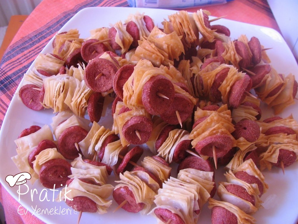 Yufkaları üst üste koyup ikiye katlıyoruz. Kapakla yufkaları yuvarlak yuvarlak kesiyoruz. Yada bıçakla kare kare kesebilirsiniz. Sosisleri de ince ince kesiyoruz. Kürdana önce sosis sonra yufka ( 4-5 tane minik kare ) olarak diziyoruz.Bir kürdanda 3 sosis olması yeterli pişince sosisler şitikleri için daha fazla takarsak kürdandan çıkarlar..