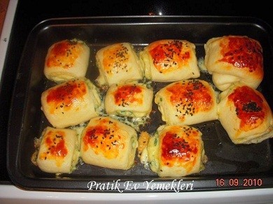 Milföy hamurunu merdane yardımı ıle dıkdortgen sekılde acıyoruz ıcersıne kasar ve maynonozu serperek rulo seklınde sarıyoruz sonra istediğiniz büyüklükte kesıp yaglanmıs fırın tepsısıne yerlestırıp uzerıne yumurta surup ıstege gore susam yada corek otu serperek onceden ısıtılmıs 200 derece fırında uzerı kızarıncaya kadar pısırıyoruz afıyet olsun.