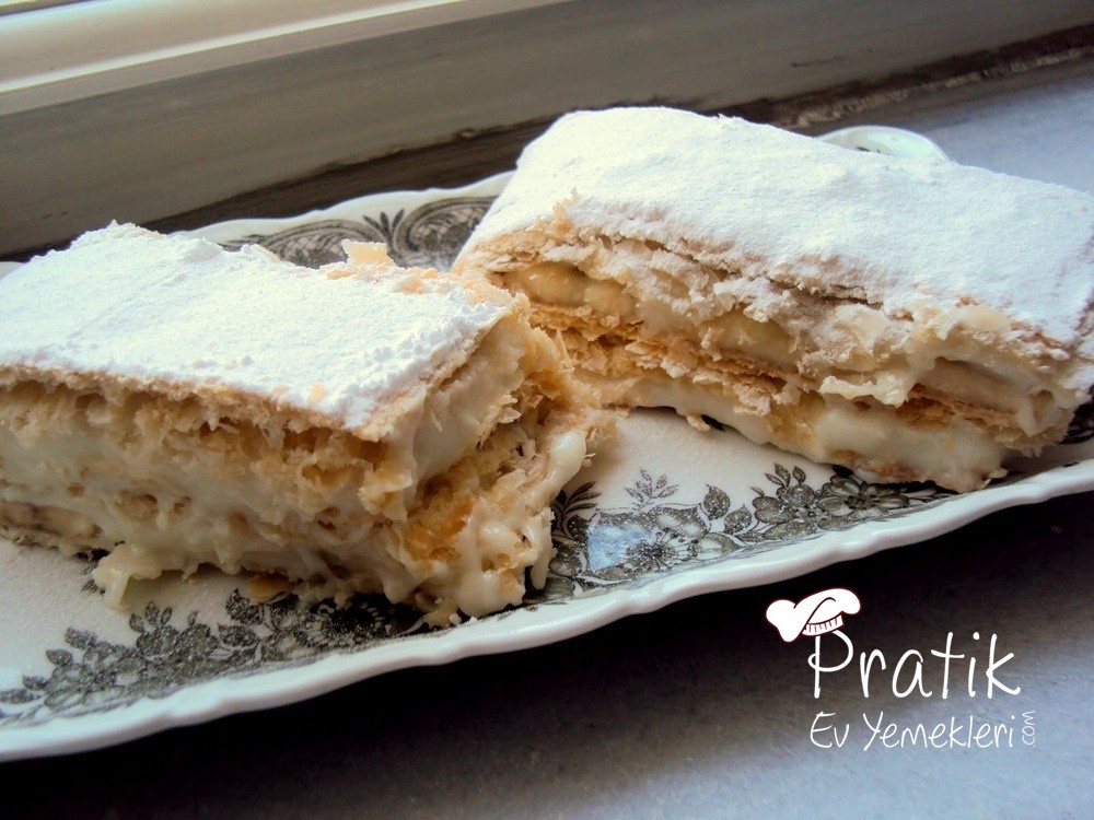 Hazırlanışı: Milföy hamurlarını oda sıcaklığında hafifçe yumuşattım. Üç tanesini yanyana koyup dikdörtgen haline getirdim ve merdaneyle açtım. (dikdörtgen midi fırın tepsime göre şekil verdim siz fırın tepsinize göre yapabilirsiniz). Tepsiye yağlı kağıt kestim hamuru yerleştirdim. Üzerine tekrar yağlı kağıt kapattım milföyü koydum. Bu şekilde üç kat hamur hazırladım. Son hamurun üzerine de yağlı kağıt koydum ve üzerine alttki tepsiyle aynı ölçülerde başka bir tepsi yerleştirdim. Böylece milföyler kabarmadan çıtır çıtır kızarıyor. 200 dereceye ısıttığım fırında iyice kızarıncaya kadar pişirdim. Milföyleri soğuttum ilk tabakanın üzerine kremanın yarısını yaydım muz dilimleri serpiştirdim. İkinci katı da aynı şekilde hazırladım ve üçüncü milföy tabakasının üzerine sadece pudra şekeri eledim. Servis yaparken kare ya da uzun dilimleyebilirsiniz. Keskin bir bıçak kullanın lütfen.