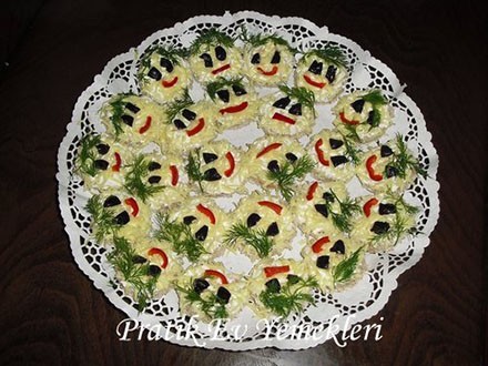 Bir çaybardağı yardımıyla tost ekmeklerimizi yuvarlak biçimde kesiyoruz.Üzerine krem peynir sürüyoruz daha sonra rendelenmiş kaşar peynirine bulayıp süslemeye geçiyoruz zeytinden gözler dereotundan saçlar ve kırmızı biberden dudaklar yapıyoruz. Çocuk menülerinde vazgeçilmez.
