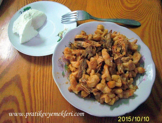 Hamuru dinlendirirken iç harcı için soğanları küçük küçük doğruyoruz. Ve kıymanın üzerine ekliyoruz .Baharatları da sırasıyla ekledikten sonra iyice karıştırıyoruz. Dinlenen hamuru 2 eşit parçaya ayırıyoruz. İlk parçayı un serperek açıyoruz. Açılan mantı yufkasını enine ve boyuna keserek küçük kare parçalar elde ediyoruz. İkinci hamur parçasına da aynı işlemi uyguluyoruz. Hazırlanan mantı parçalarıın içine kıymalı harcı minik parçalar halinde koyarak dört kenarı bir araya bohça şekline getirerek kapatıyoruz. Tüm mantı parçalarını kapatıp un serpilmiş bir tepsiye diziyoruz. Derince bir tencerede su kaynatıp, içine mantıları atarak mantıları pişirip süzüyoruz. Üzerine sarmısaklı yoğurt sosu dökerek karıştırıyoruz. Servis tabağına aldığımız yoğurtlu mantıların üzerine pişen etli nohut sosunu dökerek yöresel yemeğimizi sıcak sıcak servis yapıyoruz. Afiyet olsun.