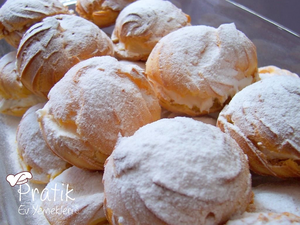 6. Fırından aldığınız bezelerin biraz ılınmasını bekledikten sonra bıçakla ikiye kesin. Arasına kremadan 1 dolu yemek kaşığı koyup kapatın, hafifçe bastırın. Hazırladığınız rüzgar torbalarını servis tepsisine sıralayarak üstlerine elekle bolca pudra şekeri eleyin. Bu tarif almanların yaptığı bir tatlı ve adı Windbeutel’miş umarım sizlerde beğenirsiniz:) Afiyet olsun