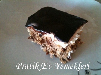 Bir tencerede ölçüsüyle çikolata sosunu hazırlayıp kenara sogumaya alıyoruz.Üstü kabuklanmasın diye ara ara karıştırıyoruz.ardından ölçüsüyle iki paket şantiyi hazırlayıp dolaba bırakıyoruz…Bir kapta bisküvileri kırıp içersine kabuğunu soyduğumuz elmaları minicik dogruyoruz ( rende sulandırıyor ) 3 kaşık süt ekleyıp karıstırıyoruz. Soguyan şantinin yarısını ıcersıne koyup karıştıdıktan sonra bir borcamın tabanına bıraz su tutup ıslatıyoruz ( yapışmasın dıye )malzememızı tepsıye yayıp üzerine kalan şantiyi döküyoruz.Biraz dolapta bekletıp bi 15 dk kadar sonra üzerine çikolata sosu döküyoruz…..