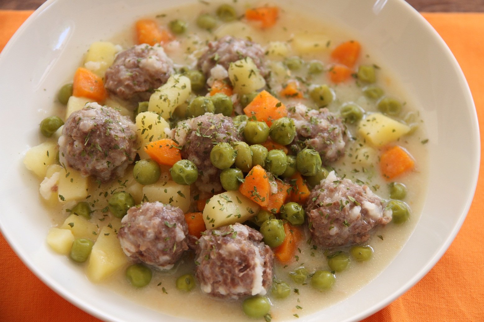 Kıyma, irmik, pirinç ve yumurtanın sarısı yoğurulur. Fındık büyüklüğünde köfteler yapılır. (köftelerin yarısını yemeğe koydum, yarısını dondurucuya koydum.)Bir kaseye bir miktar un konur. Köfteler unun içine konur ve sallayarak her tarafının una bulanması sağlanır. Bir tencereye 3-4 su bardağı su konur , kaynatılır. Kaynayan suya köfteler patates ve bezelye konur. Havuç da konabilir. Piştikten sonra içine 1 tatlı kaşığı zeytinyağı eklenir. 9 aydan önce blenderden geçirilerek, 9 aydan sonra (dişler çıktıysa) çatalla ezilerek yedirilir. Bu miktarı 2 öğünde yedirdim.(Ben oğlumun yemeklerine eti cicibebe ekmeği de koyuyorum. 1 paket ekmeği robotta çekiyorum, kavanoza koyup buzdolabında saklıyorum. )