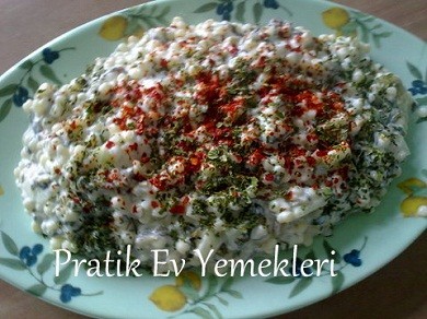 Semiz otu az yağda kavrulurak suyu çekinceye kadar pişirilir. Sarımsaklı yoğurda salatalık, isteğe bağlı olarak konserve mısır, haşlanmış kuskus da koyularak karıştırılır. Üstüne nane ve kırmızı biber de koyularak servis yapılır. Afiyet olsun…