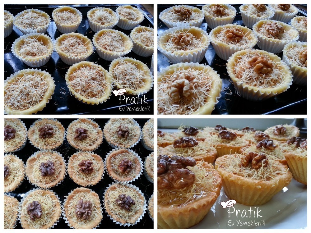 Dinlenen hamurumuzdan küçük parçalar alıp muffin kağıtlarına iyice bastırarak yerleştiriyoruz. Ortası boş olacak şekilde bütün kalıpları hamurumuz bitene kadar kapladıktan sonra, biraz buzdolabında dinlendirip, ortasına kavurduğumuz kadayıfları paylaştırıyoruz. Hepsinin üstüne birer ceviz parçası koyup, 185 derece de önceden ısıtılmış fırında ortalama 30-35 dakika hafif kızaran kadar pişiriyoruz.