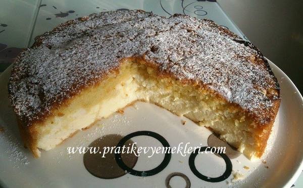 Kreması için yine yumurta ve şekeri çırpıyoruz. Diğer tüm malzemeleri ekleyip, tekrar çırpıyoruz. Sonra hazır olan kremayı kek hamurunun üstüne çok yavaş bir şekilde dökün. Üzerini yavaşca düzeltin. Önceden ısıtılmış 180 derece fırında 50-55 dakika pişirin. Pişen keki soğuyunca kalıbından çıkarın. Göreceksiniz ki krema bölümü alta kek kısmı ise üste çıkıyor. En üstüne pudra şekeri serpin. Dilimleyerek servis yapın. Afiyet olsun