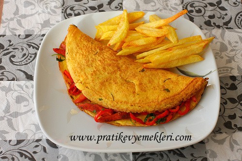 Yumurtaları kırıp çırpın. İçine mısır unu, un ve tuzunu ekleyip tekrar çırpın. İçini hazırlamak için tavaya tereyağını alıp eritin. İnce ince doğradığınız kırmızı biberi kavurun. Ardından şerit halinde doğradığınız sosisleri kavurun. En son maydanozu ekleyin ve karıştırın. Soteleme işi bittikten sonra baharatları ekleyin. Omlet tavasında biraz tereyağı eritin ve çırpılmış yumurtayı tavaya yayın. Üzerini kapatarak biraz pişirin. Biraz piştikten sonra yaptığınız soteyi omletin yarısına aktarın ve üstünü kapatın. Afiyet olsun