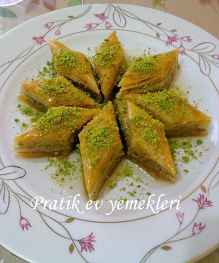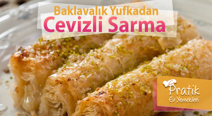 Baklavalık Yufkadan Cevizli Sarma Tatlısı Tarifi MALZEMELER ; 6 adet baklavalık yufka 100 gr tereyağı Dövülmüş ceviz Şerbeti İçin: 1,5 su bardağı su 1,5 su bardağı toz şeker 3 damla limon suyu Üzeri İçin: Yeşil toz fıstık