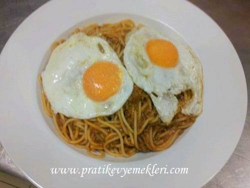 Bolonez Soslu Spagetti yarım paket spagetti Sos Malzemeleri; 250 gr kıyma 1 küçük soğan 2 diş sarımsak 1 adet domates 1 çorba kaşığı domates salçası 1 çorba kaşığı biber salçası tuz, karabiber Üzeri için; 2 adet yumurta Bu bolonezli spagetti tarifimiz alışılmışın dışında bir tarif çünkü üzerinde yumurta var:) çoğu italyan restoranında bolonezli spagetti istendiğinde […]