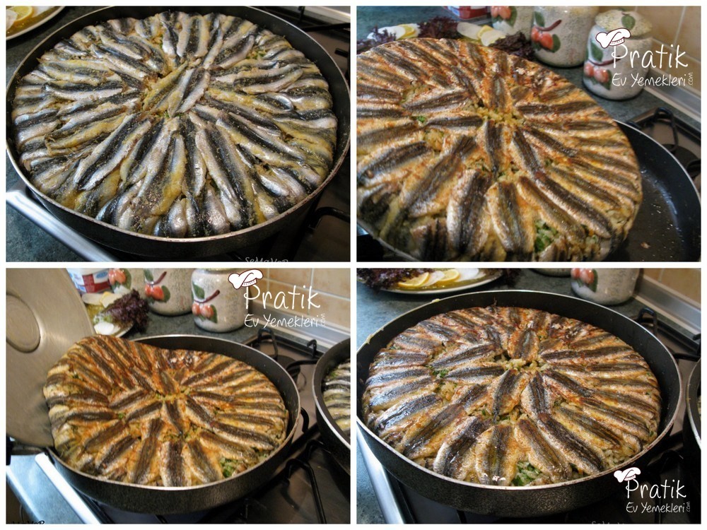 ilk önce soğanları zeytin yağında kavuruyoruz içine birazda tereyeğı eklenirse daha lezzetli olur. Daha sonra 2 bardak pirinci ekleyip güzelce kavuruyoruz. Tuzunuda ekliyoruz. 3 su bardağı su ekleyip ağır ateşte pilavı pişiriyoruz. Piştikten sonra içine yarım demet maydonozu ve bolca karabiberi ekleyip karıştırıyoruz. Büyük boy bir balık tavasına ayıklanıp temizlenmiş hamsilerimizi yanyana sıkı sıkı diziyoruz. Tavanın yan taraflarınada hamsiler diziyoruz.(yanlara dizilen hamsilerin sırtlarını mısır ununa batırırsak daha rahat dizilir kaymaz) İçine pilavı döküp üzerine tekrar hamsi