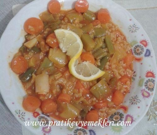 Pırasayı dimleyerek doğrayın. Havucu yuvarlak şekilde kesin. Tencereye zeytinyağı koyun ve havucu kavurun. Pırasayı ekleyin bir kaç dakika daha kavurun. Salçasını ekleyip, pirinci atın. Tuz, şeker ve damak tadınıza göre limonun suyunu ekleyin. En son sıcak suyunu ekleyin ve kısık ateşte pişmeye bırakın. Pırasaların dağılmaması için çok karıştırmayın ve dikkatli karıştırın. İster ılık, ister soğuk bir şekilde yiyebilirsiniz. Afiyet olsun.